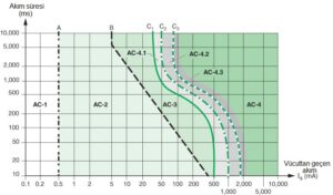 3. Bölge, tehlikeli bölgedir, tehlikeli kalp fibrilasyonları bu bölgedeki akım şiddetlerinde meydana gelir. Akımın belirli bir süre etki etmesi halinde kalp bundan zarar görür ve ölüm baş gösterir; buna kalp ölümü denir.